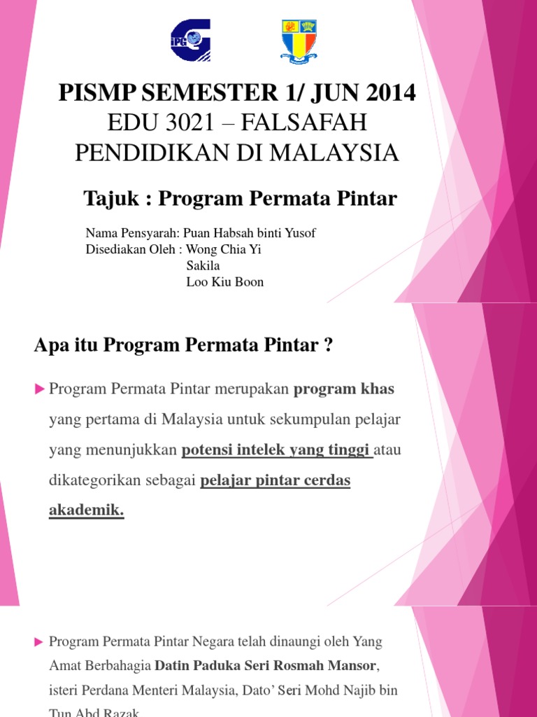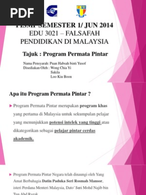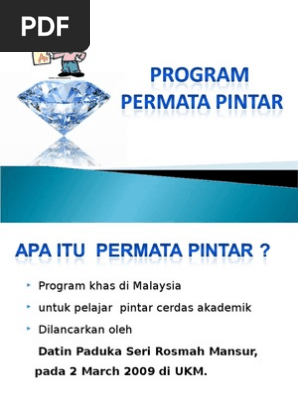 Dengan segala hormatnya saya menarik perhatian kepada perkara. Program permata merupakan projek perintis negara dimana cetusan idea penubuhanya oleh datin paduka seri rosmah mansor sebagai pegerak bersama beberapa badan profesional negara yang lain. Program permata pintar adalah antara insiatif yang diperkenalkan oleh permata bagi mengenalpasti dan membangunkan kanak kanak yang berbakat besar dan semulajadi dalam bidang sains teknologi kejuruteraan dan matematik seterusnya menjadi modal insan yang membantu negara mencapai status maju menjelang 2020.