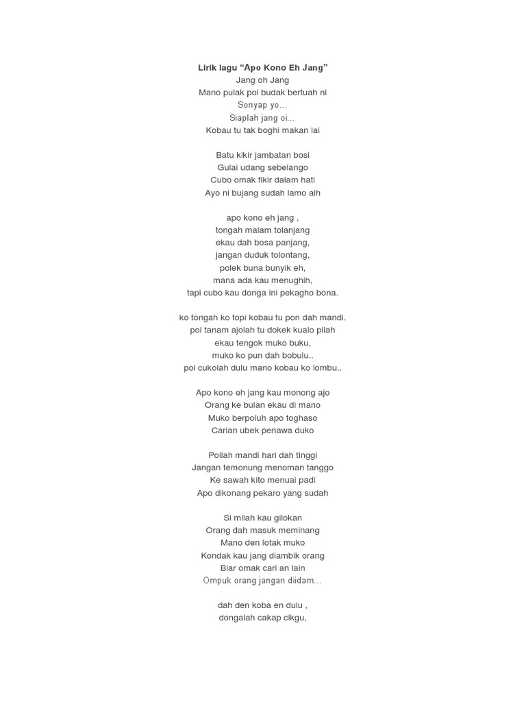 Apo kono eh jang jang oo jang mano pulak poie budak bertuah ni sonyap jo siaplah jang oi kobau tuh tak boie makan laie batu kikir jambatan bosi gulai udang sebelango cubo mak pikir dalam hati sayo nih bujang sudah lamo ai apo kono eh jang ko monong ajo orang ke bulan ekau di mano muko berpoluh apokah rosah carian ubek penawar duko poie lah mandi ari dah tinggi jangan. Lirik lagu apo kono eh jang ac mizal ft rafidah fida jang oh jang mano pulak poi eh budak bertuah ni sonyap yo siaplah jang oi kobau tu tak boghi makan lai. Apo kono eh jang kau monong ajo orang ke bulan ekau di mano muko berpoluh apo teghaso carian ubek penawa duko.