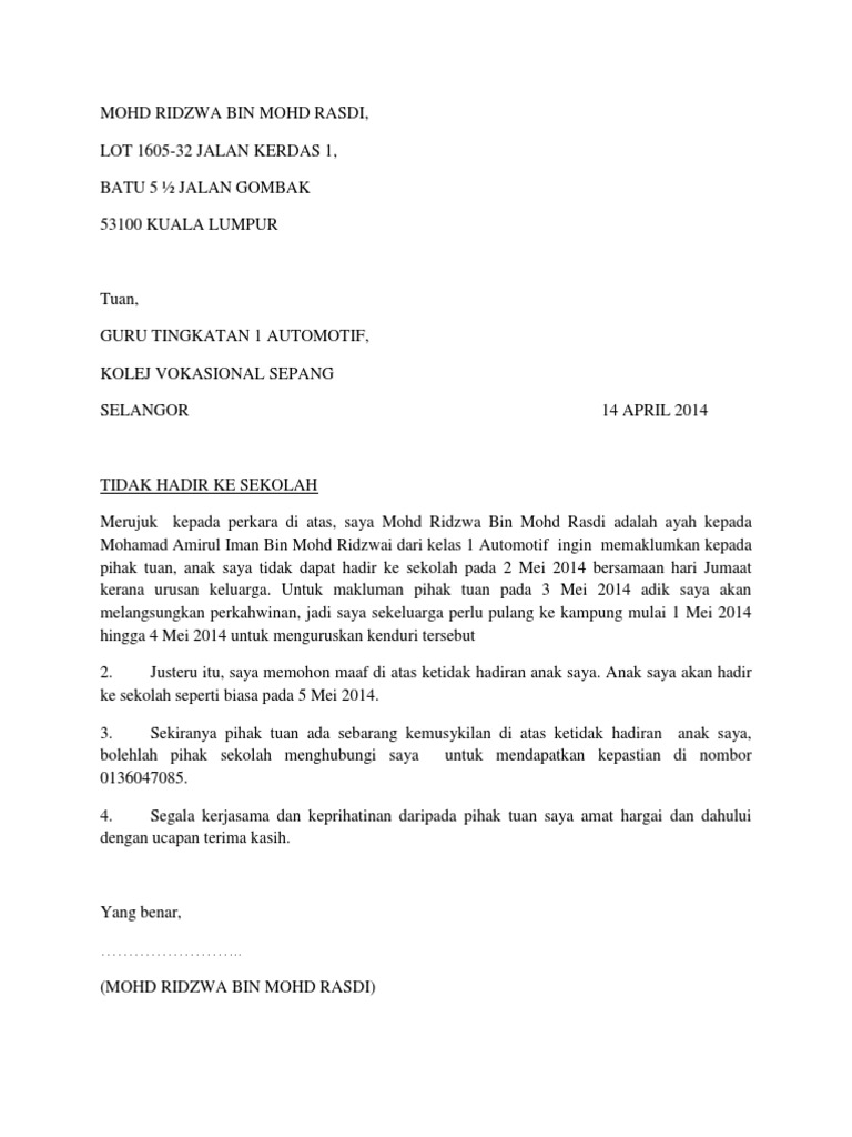 Surat Rasmi Tidak Hadir Ke Sekolah Atas Urusan Keluarga Dan Sebagainya