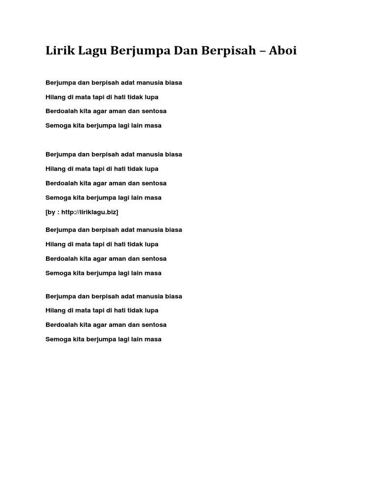 Berdoalah kita agar aman dan sentosa semoga kita berjumpa lagi di lain masa berdoalah kita agar aman dan sentosa semoga kita berjumpa lagi di lain masa. Lirik lagu berjumpa dan berpisah aboi. Bertemu dan berpisah bertemu dan berpisah adat manusia biasa hilang di mata tapi di hati tidak lupa berdoalah kita agar aman dan sentosa semoga kita berjumpa lagi lain masa auld lang syne should all acquaintance be forgot and never brought to mind should all acquaintance be forgot for the days of auld lang syne for auld lang syne my dear for auld lang syne lets take a cup of kindness.