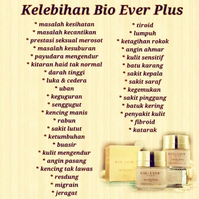 Sama seperti testimoni pengguna bio ever plus ni yg cuba sapukan bio ever pada anak dia. Bio ever plus age reversing cream diformulasikan dengan ekstrak tumbuhan semulajadi iaitu kacang soya glycine soja pegaga centella asiatica wild yam dioscorea villosa dan japanese long life grass chou mei sou. Krim bio ever plus.