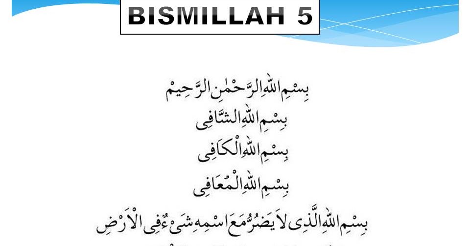 Bismillah 5 dan terjemahan. Malah bacaan bismillah 5 ini memang sudah sering digunakan sebagai amalan sejak dulu lagi. Bismillah 5 sungguh mujarab buat penawar. Maka hendaklah dibaca bismillah 20 setiap hari dan malamnya.