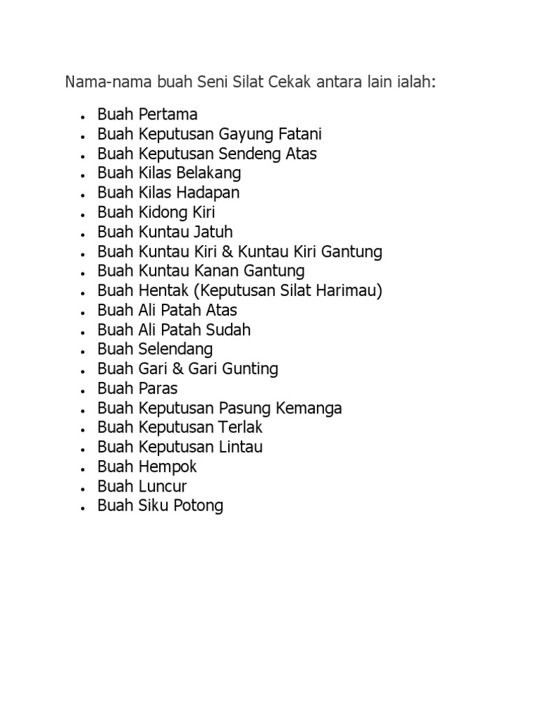 Buah silat cekak malaysia. Pengajaran cara memotong atau menyekat kesemua 21 buah yang tersebut itu. Buah pertama buah kilas belakang buah kidung kiri buah hentak buah ali patas atas buah ali patah sudah pecahan pertama buah selendang buah paras buah keputusan pasong kemanga buah luncur buah siku potong. Buah umum mempelajari keseluruhan teknik pertahanan dan serangan untuk digunakan secara praktikal.