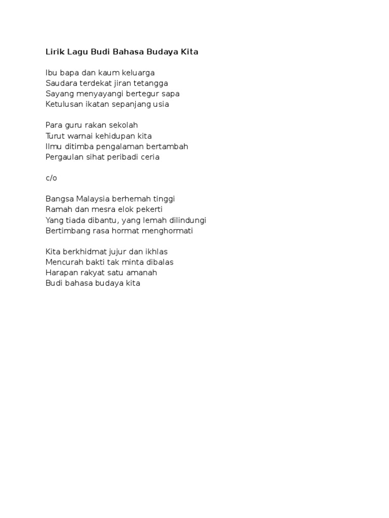 Lirik lagu budi bahasa budaya kita 1. Budi bahasa budaya kita jadi amalan bersama bunga cina di atas batu daunnya lepas dalam ruang adat di dunia memang begitu kerna harta budi terbuang contohi akhlak mulia dari nabi junjungan walau dicaci dihina ditempuh dengan iman sarat perahu muatan pinang singgah berlabuh di kuala daik jahat laku lagi akan dikenang inikan pula budi baik. Budi bahasa budaya kita budi bahasa budaya kitaibu bapa dan kaum keluarga budi bahasa budaya kitasaudara terdekat jiran tetangga ibu bapa dan kaum keluargasayang menyayangi bertegur sapa saudara terdekat jiran tetangga ibu bapa dan kaum keluargaketulusan ikatan sepanjang usia sayang menyayangi bertegur sapa saudara terdekat jiran tetangga ketulusan ikatan.