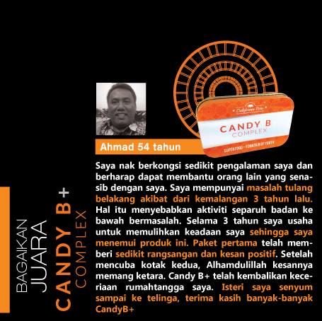 Candy b plus complex is a vitamin suppliment contains of b1 b6 b12 maca tribulus goji soy lecithin fructose orange extract. Dunno the price bcoz never buy. Namun semua produk ada kesan sampingannya.