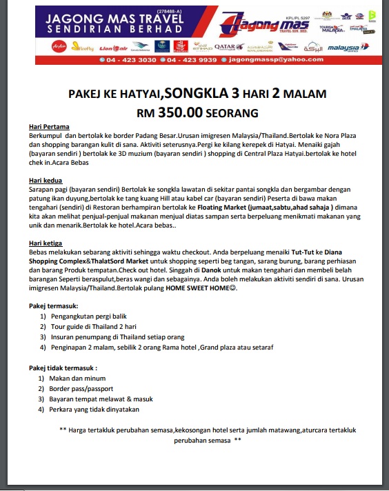 Rm299 pax termasuk transport. 10 3 2019 ahad chartered tuktuk 1000 baht 8 00 am salma restaurant jalan kaki 10 min 9 00 am hat yai municipal park trip.