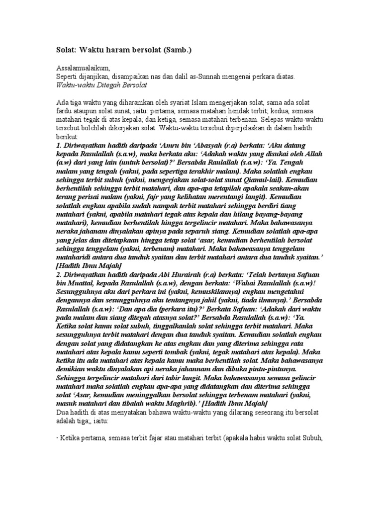 Tiga waktu haram berhubung dengan waktu. Waktu tersebut adalah. Kami pun telah menyebutkan bahwa larangan mengerjakannya di awal waktu setelah subuh dan ashar bersifat ringan.
